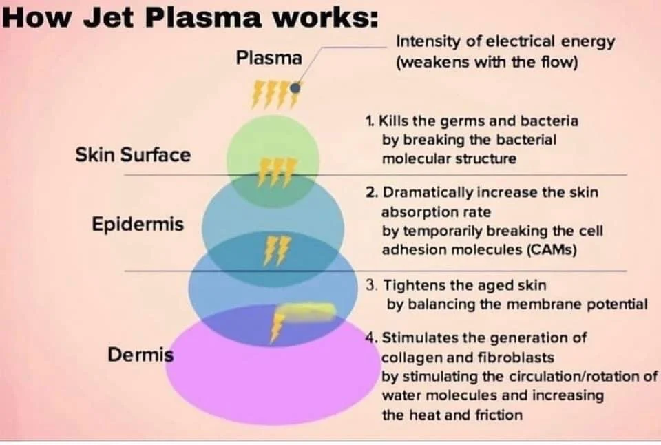 Graphic showing how jet plasma works from the skins surface to the dermis: it kills germs, increases skin absorption rate, tightens, stimulates collagen + fibroblasts.